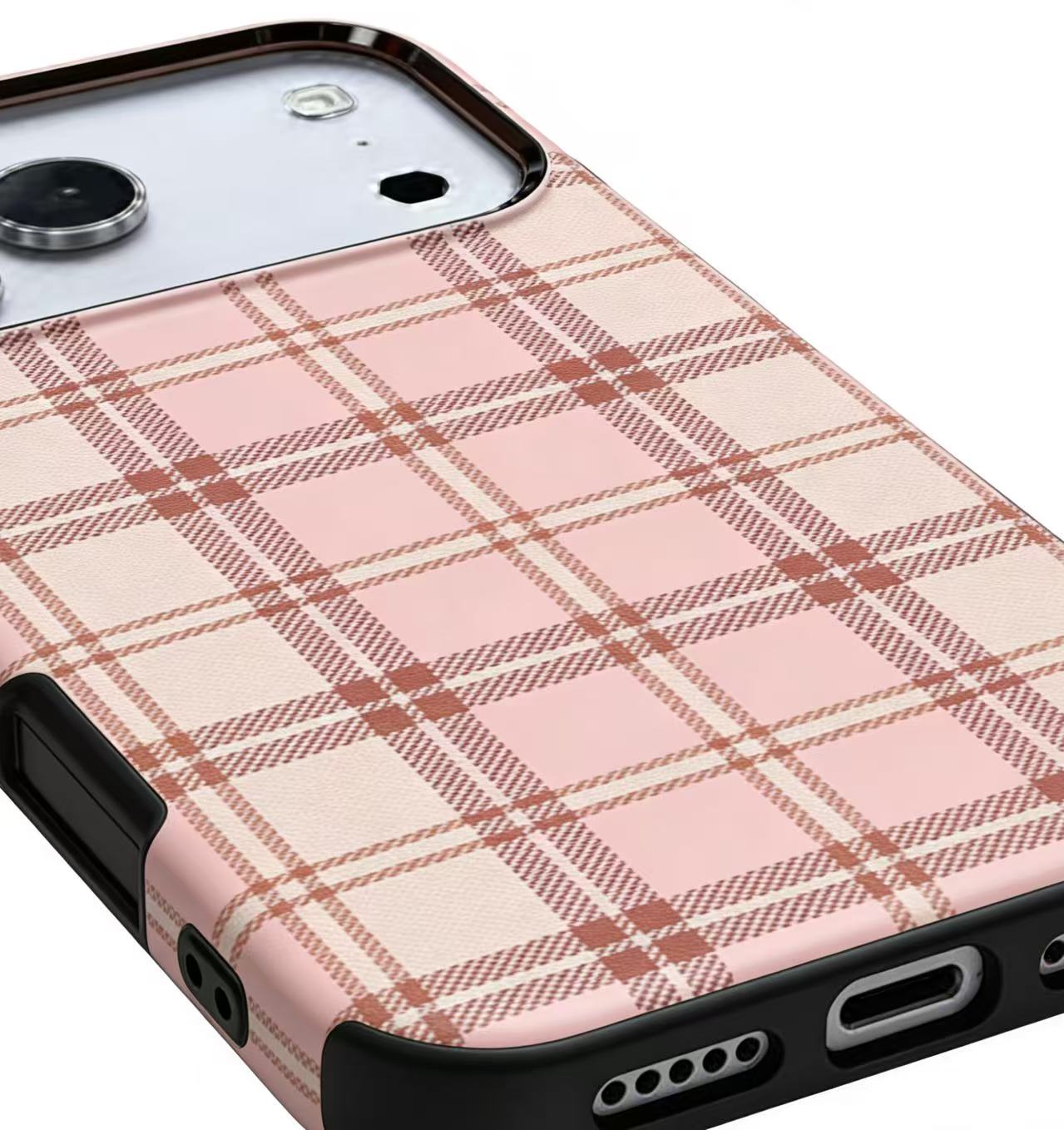 商品描述:<br/>FrameFlick 以「温柔包裹与细腻质感」为核心理念,从韩系复古学院风中汲取灵感,打造「粉糯格纹」系列手机壳。柔粉底色搭配暖棕格纹肌理,低饱和配色温柔又高级,细腻磨砂表面防汗防指纹,握感温润舒适。双层防护结构:PC硬壳抗摔支撑,TPU软边框贴合机身,内里植绒内衬避免刮花,加高镜头圈精准保护镜头,让颜值与防护兼具,为日常增添治愈氛围感。